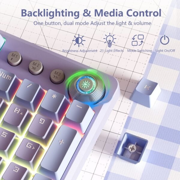 - 【Dual Color Keycaps & RGB Backlit】: This cute keyboard combines purple and blue keycaps to add a unique color to your desktop. Customize your backlighting with this illuminated keyboard featuring top-of-the-line LEDs with 21 backlighting effects. Short press to toggle the light effect when the knob is on and long press on the M1, M2 and M3 keys to set a custom light effect to inspire your creativity and create your own personalized work or play environment